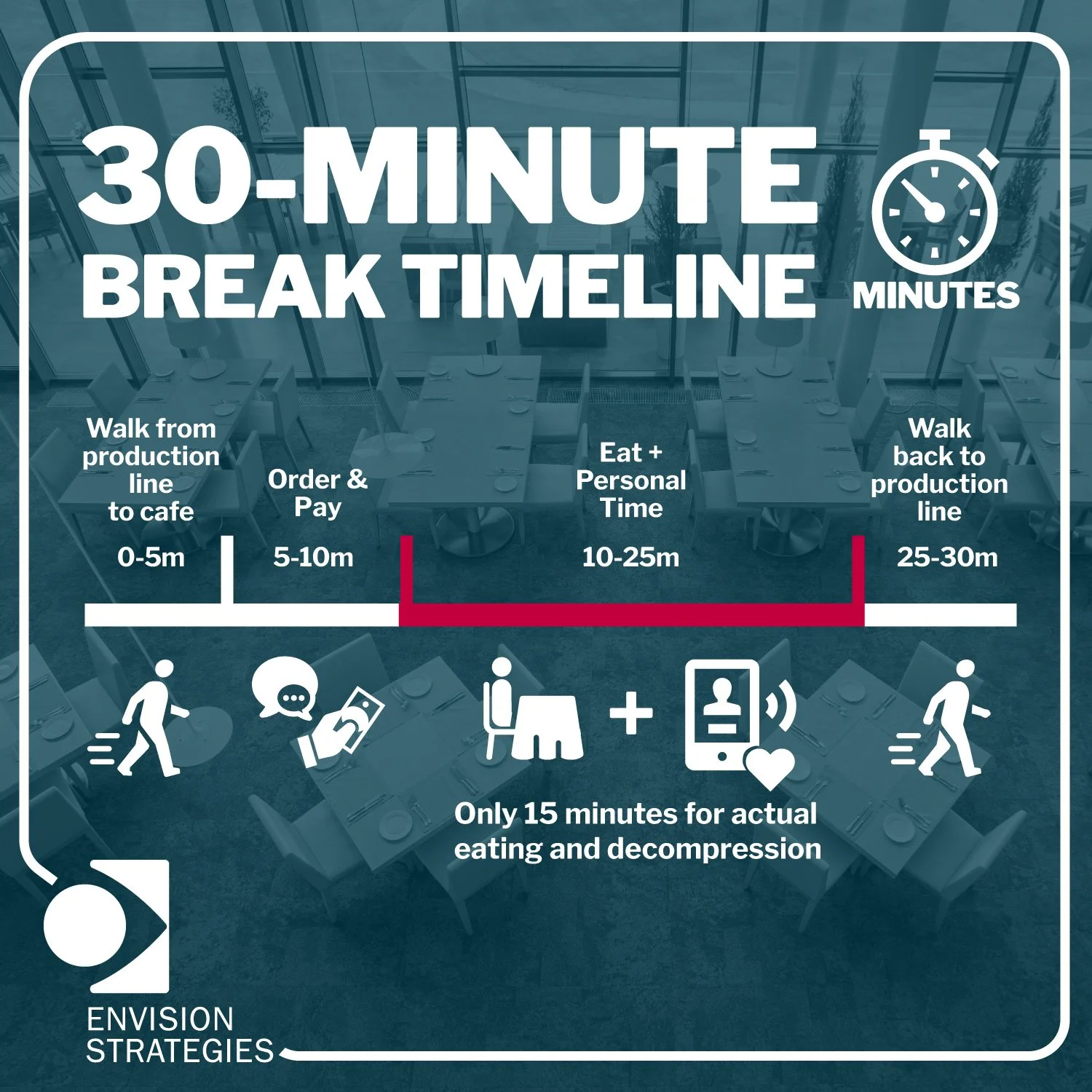 Add location constraints to timing constraints, and the challenge becomes clear. Most manufacturing facilities sit off state roads in industrial areas where lunch options are limited to fast food. A 30-minute break doesn’t allow time to drive somewhere else, order, eat, and return.