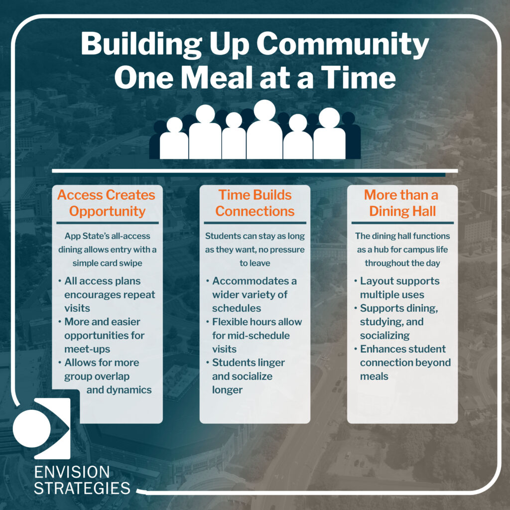 What App State demonstrates is that students will choose community when the environment supports it. Converting to all-you-care-to-eat dining was an investment in creating spaces where students could spend time together without transaction limits or time pressure.